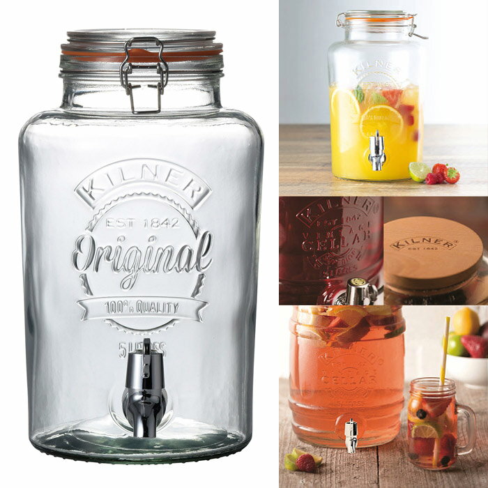 パーティにお勧めのディスペンサー 商品情報 サイズ(約) 幅250×奥行185×高さ31cm 容量(約) 本体5.0L 重量(約) 2.2kg 材質 ソーダガラス・ステンレススティール シリコン・ABS樹脂 ブランド名 KILNER(キルナー) メーカー国 イギリス 生産国 中国 使用上の注意 使用前に洗って下さい。