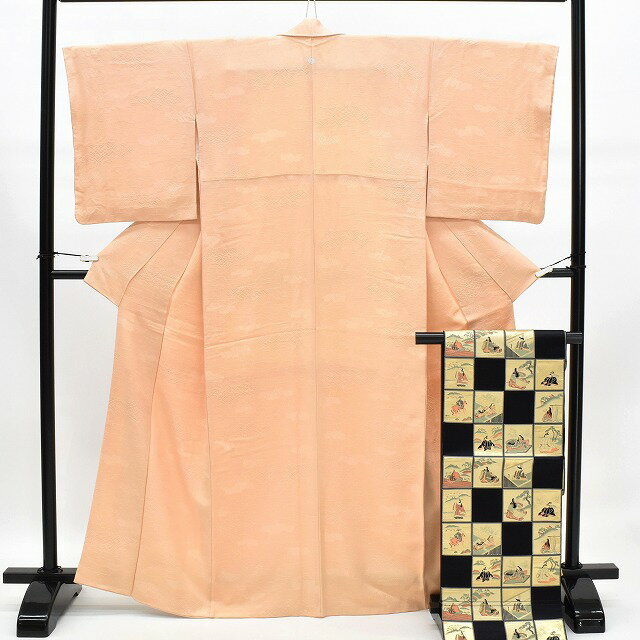 説明 オレンジ色地に花地紋織で、日向紋の五三桐一つ紋がついている色無地のお着物に黒色に市松、人形文様があしらわれた名古屋帯の2点セットです。