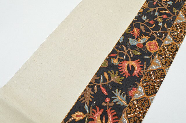 説明 ベージュ色地に紅型文様が施された素朴な味のある九寸の名古屋帯です。